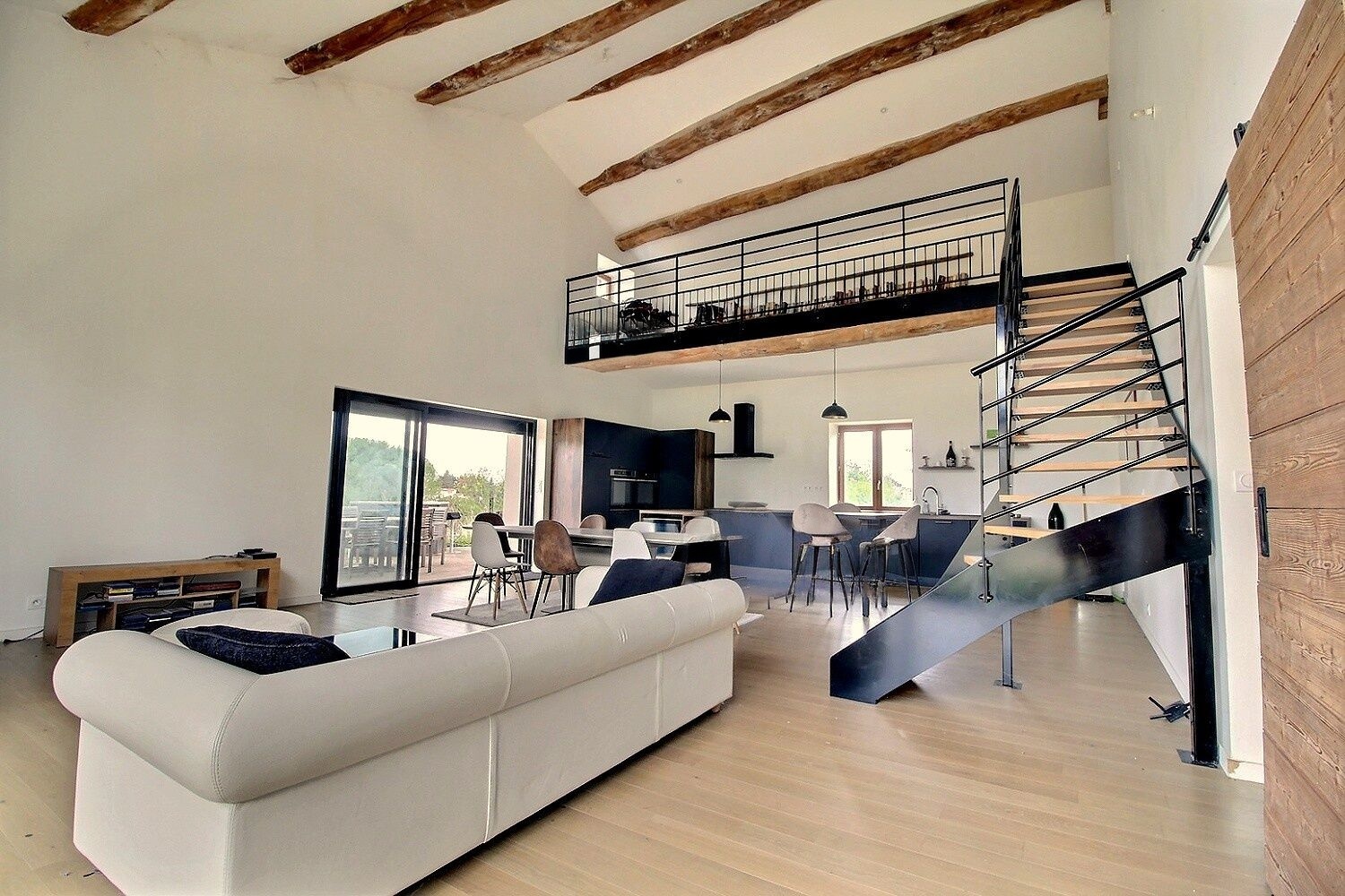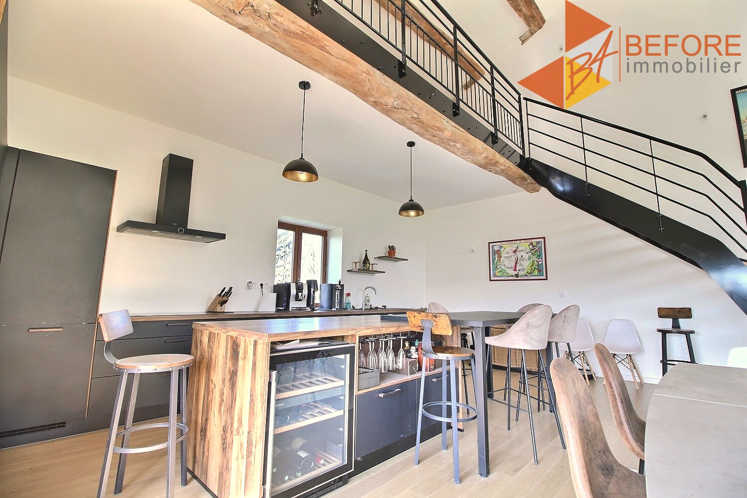 Au rez de chaussée une immense pièce de vie déplafonnée de 67m², avec une grande verrière ultra lumineuse, une cuisine ouverte sur mesure, un accès terrasse et un bel escalier design qui vous mène à une mezzanine, pouvant accueillir un espace bureau.