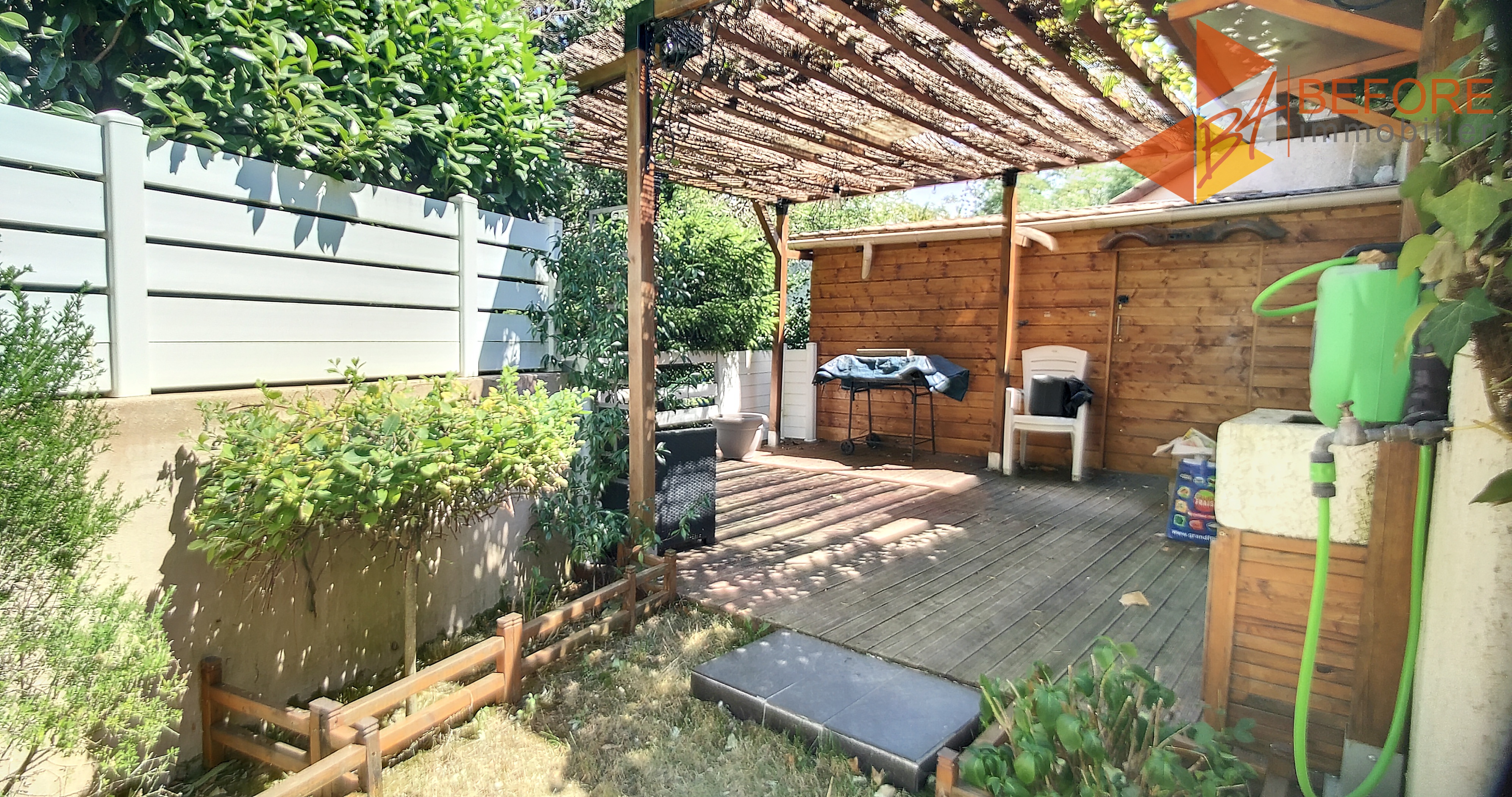 Le terrain est clos, très agréable avec ses palmiers et ses plantes vertes. Une belle terrasse couverte permet de profiter de l'extérieur, un cellier extérieur pour le rangement, la maison est vendue avec 2 places de stationnement.