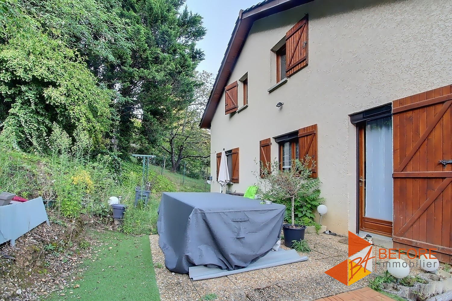 Sur un terrain de 889 m², en retrait des voies de circulation, maison des années 1990, dans un esprit chalet de montagne, comprenant au rdc une entrée pouvant être transformée en espace télétravail, une buanderie, une cave et un grand garage.