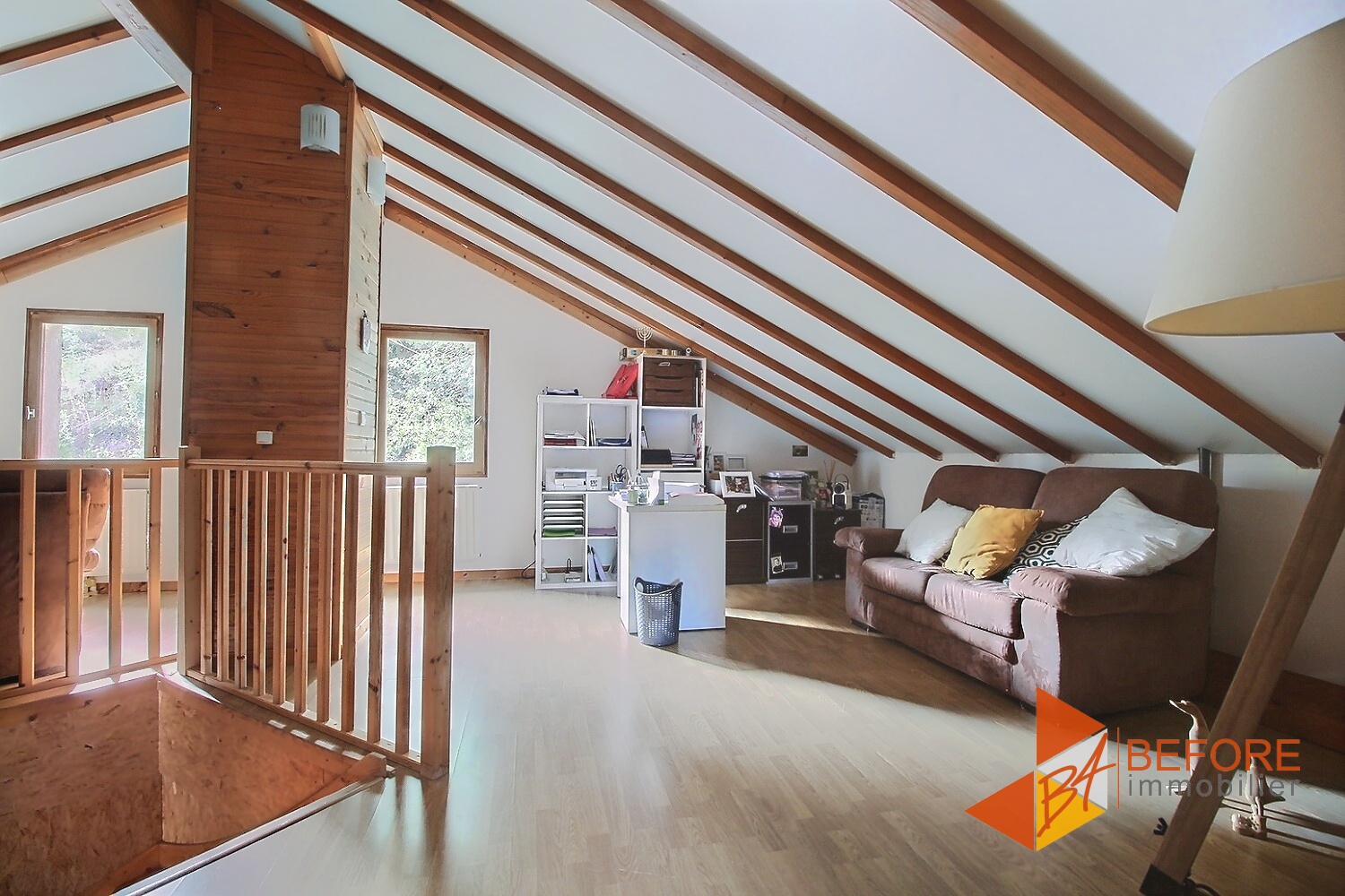 Au deuxième, 2 chambres mansardées, et une grande pièce de vie, permettant de créer soit 2 chambres supplémentaires, soit une salle de jeux, une salle de réception...gros volume, et gros potentiel.
